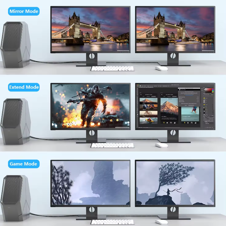 - Разширен режим - използване на външен екран като допълнителен работен плот, който може да съдържа допълнително съдържание.