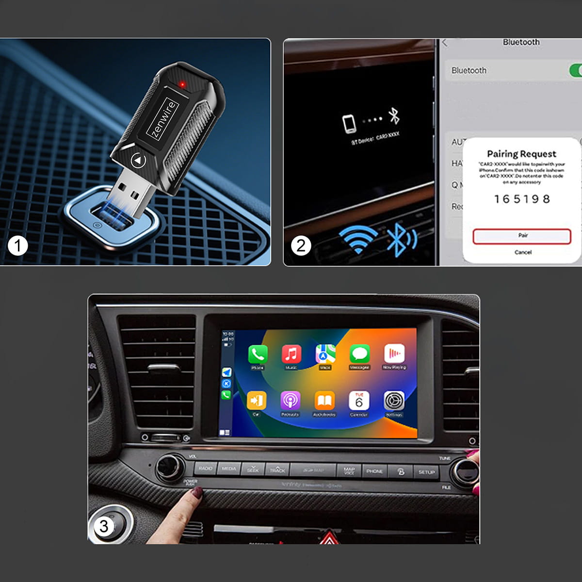 - ✅ 4. Използвайте безжично – винаги автоматично! - След първото сдвояване на устройството, автомобилът и телефонът ще се свързват с Zenwire M30 автоматично при всяко стартиране на автомобила, без докосване, повторно сдвояване с кабели или допълнителни настройки.