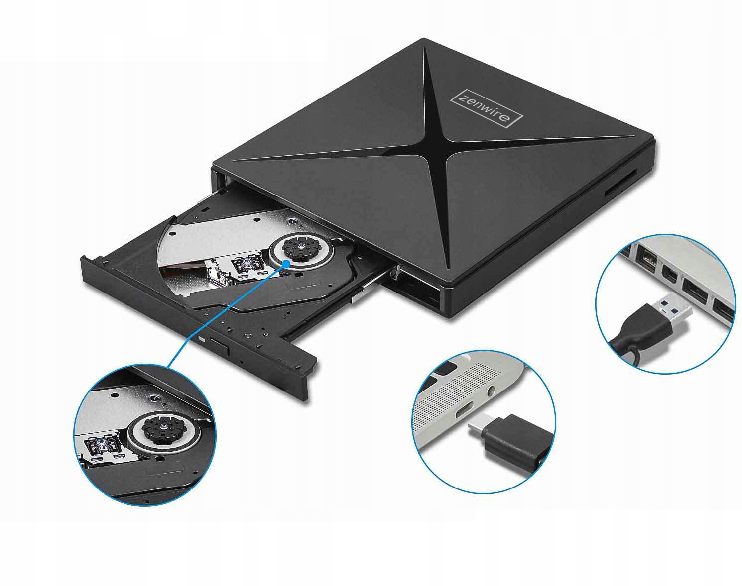 ПРЕНОСИМО ВЪНШНО УСТРОЙСТВО CD / DVD РЕКОРДЕР Zenwire 4in1 USB 3.0 с USB-C с функция USB хъб и четец на SD карти.