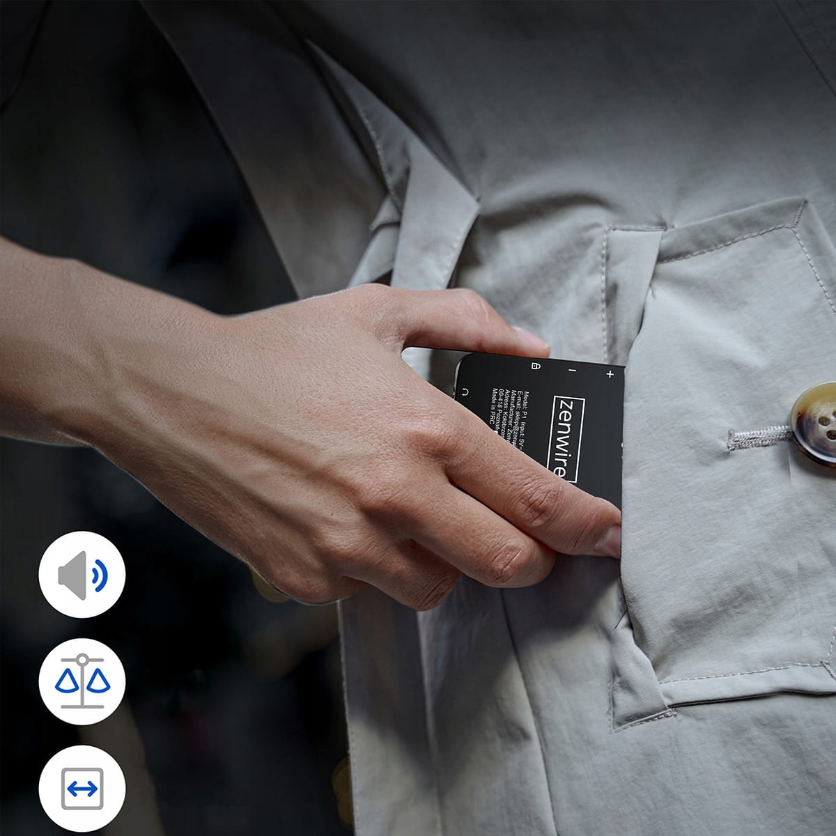 Плейърът Zenwire MP3/MP4 тежи само 80 г, а тънките му размери (75 × 52 × 12 мм) го правят лесен за поставяне в джоб, чанта или раница.