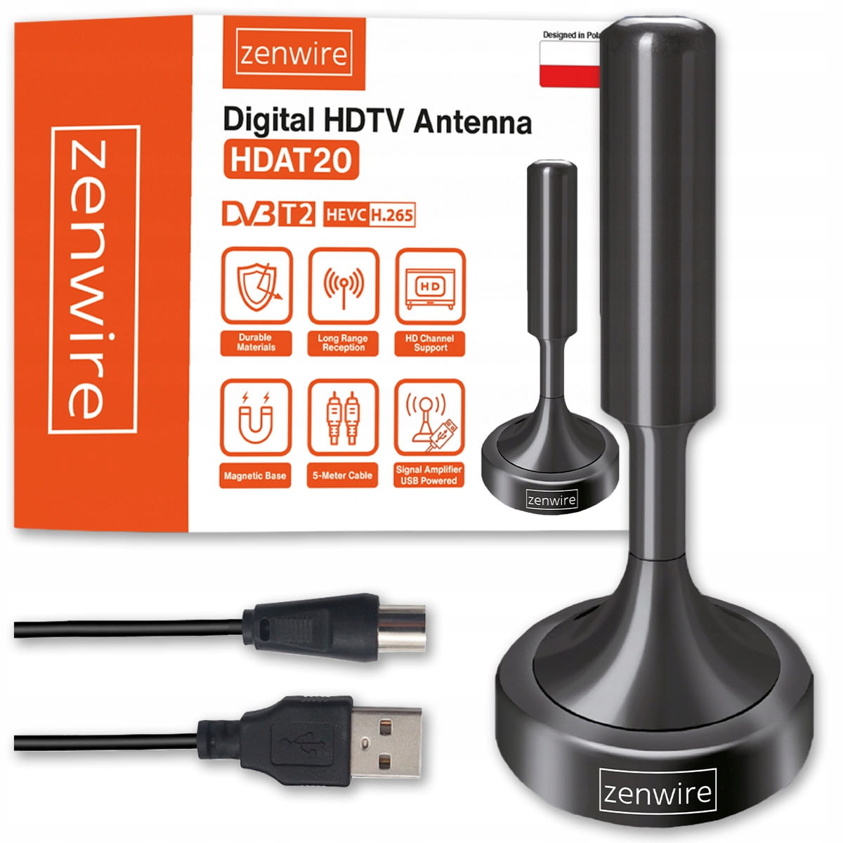 Антената Zenwire Digital HDTV Antenna HDAT20 е интуитивно и модерно устройство, което позволява приемане на цифрова ефирна телевизия в новия стандарт, валиден в Полша и цяла Европа. Пълната съвместимост с DVB-T2 / HEVC / H.265, както и поддръжката на по-стари стандарти, осигурява стабилно приемане на всички налични канали и ясна, чиста картина на всеки телевизор.