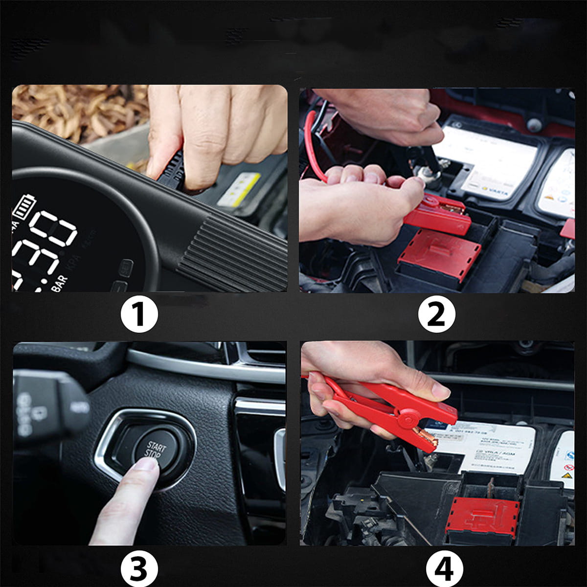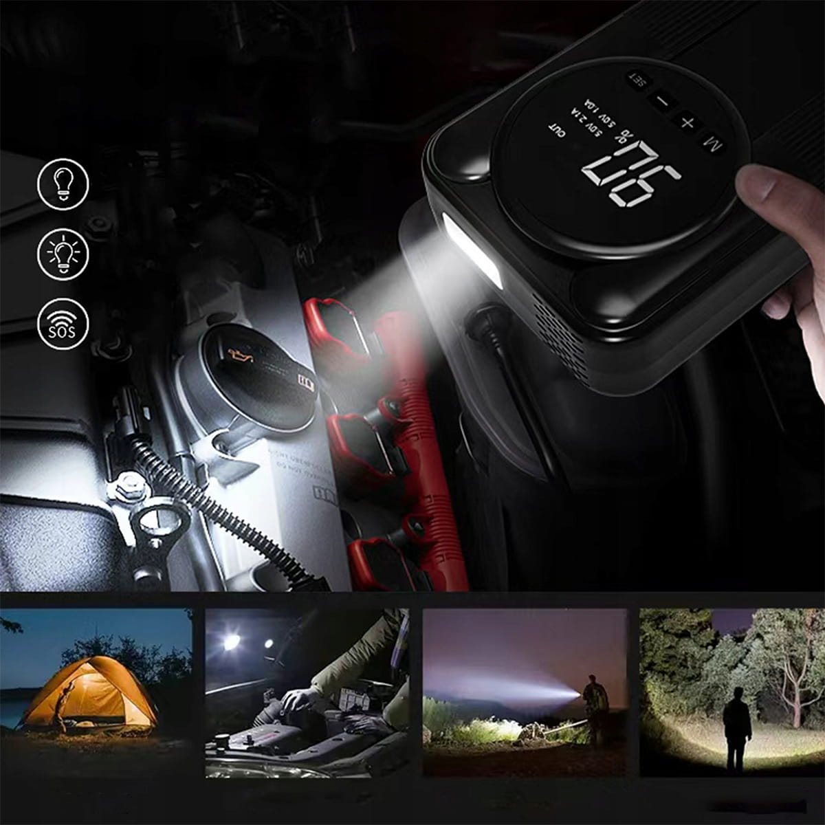 - Усъвършенствано устройство 4в1, създадено за аварийно стартиране на 12V двигатели, помпане на гуми, като ефективна външна батерия (powerbank) и фенерче.