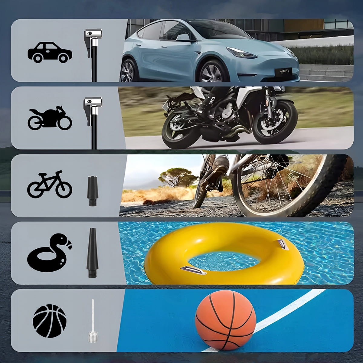 - Вградена помпа 150 PSI / 10,5 бара (120W, 25 000 RPM) позволява бързо помпане на гуми на кола, мотоциклет, велосипед или надуваеми предмети като матрак или топка.