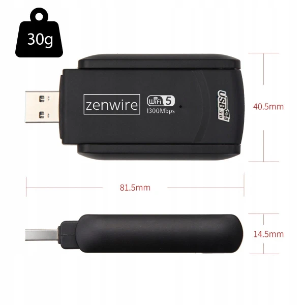- Zenwire 1300 Mbps USB WiFi адаптер с две външни SMA 2dBi антени.